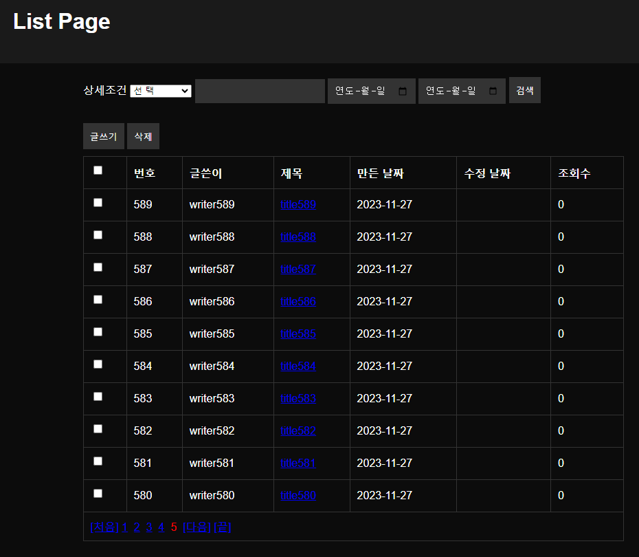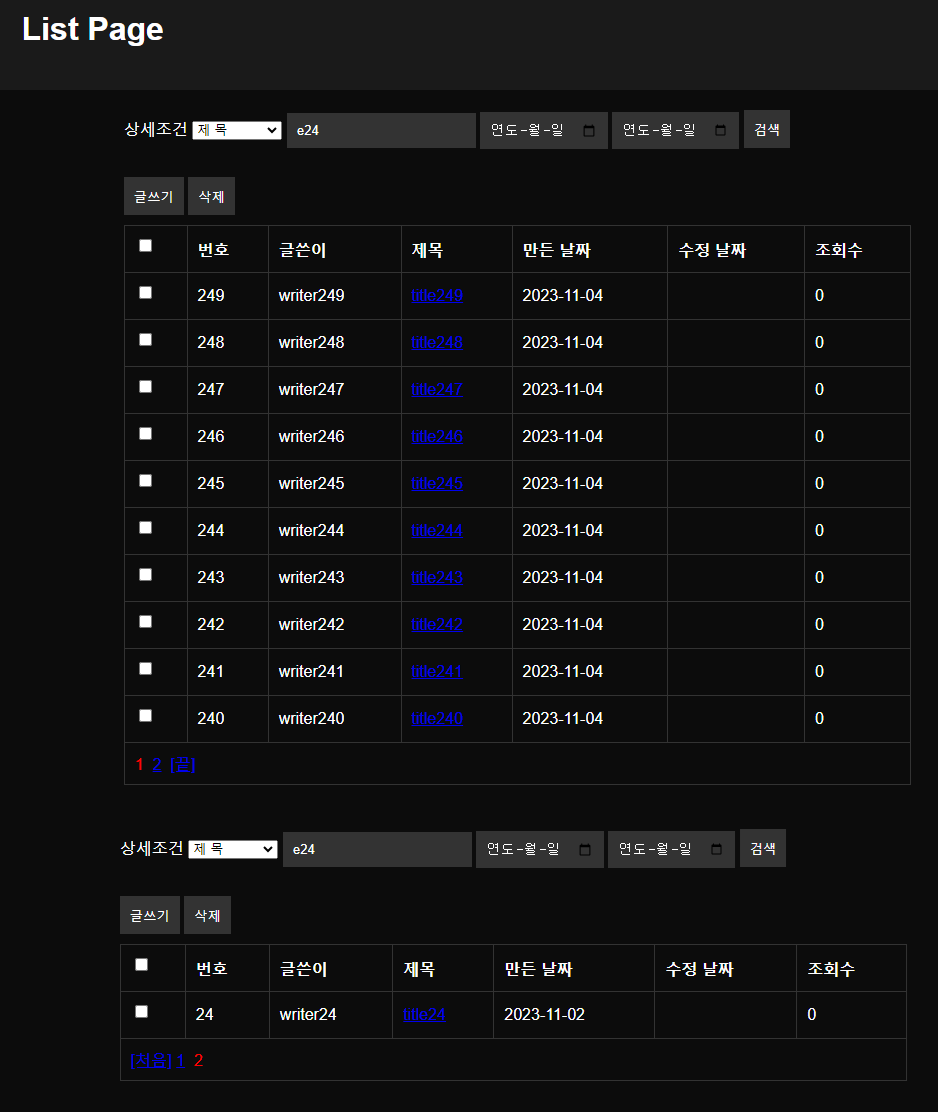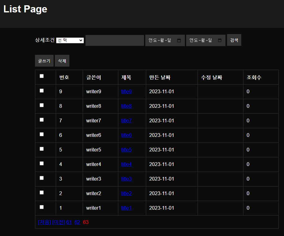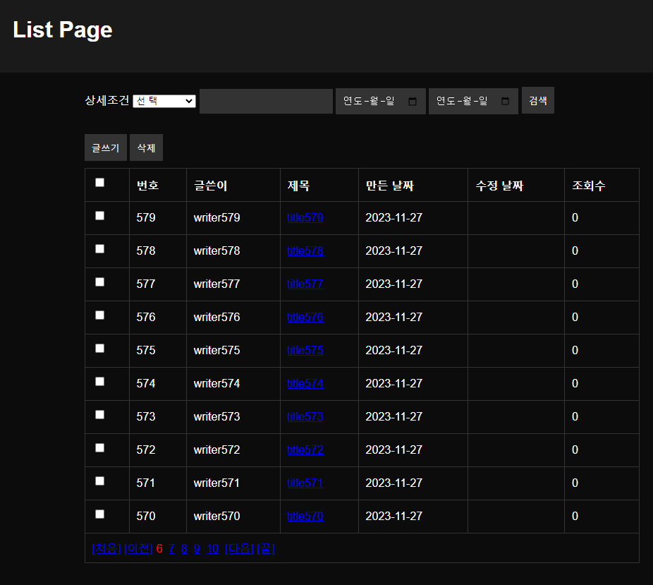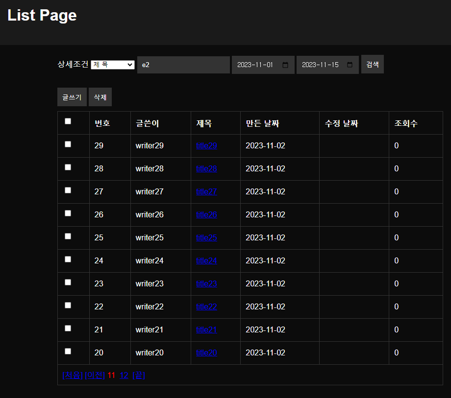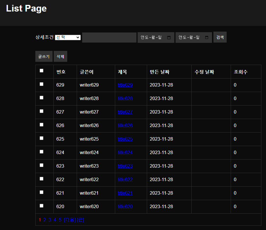 Spring - 게시판 만들기 연습(페이징 처리) 1. 실행화면01) 게시글 목록의 페이지, 다음, 이전, 처음, 끝 버튼 생성, 현재페이지 하이퍼링크 하이퍼링크제거02) 게시글 검색 후 페이지 이동시(끝페이