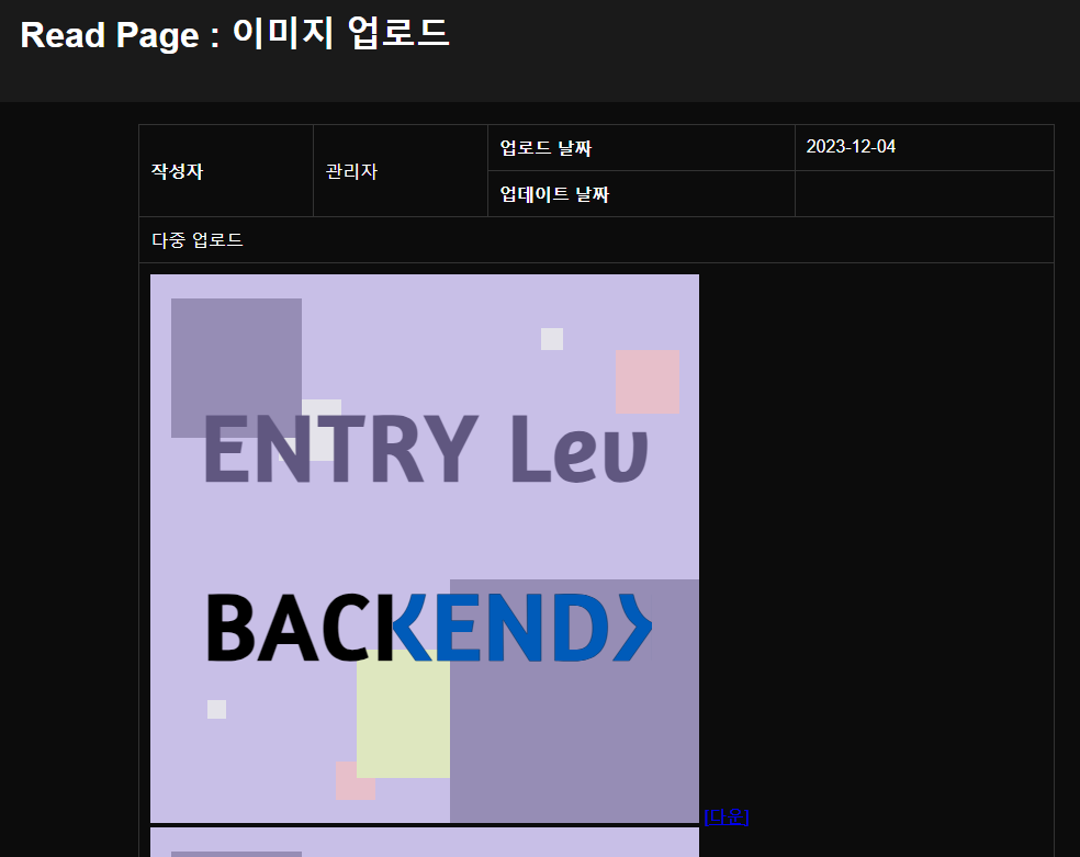 | [CRUD] 파일 업로드 및 조회 2 : 수정 및 출력 (1) | 2023.12.05 |