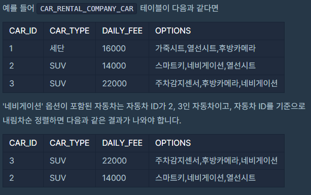 WHERE OPTIONS LIKE '%네비게이션%'