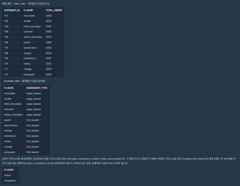 SHIPMENT_ID, FLAVOR, TOTAL_ORDER 는 각각 아이스크림 공장에서 아이스크림 가게까지의 출하 번호, 아이스크림 맛, 상반기 아이스크림 총주문량을 나타냅니다. FIRST_HALF 테이블의 기본 키는 FLAVOR입니다.