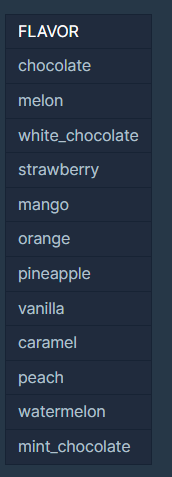 SHIPMENT_ID, FLAVOR, TOTAL_ORDER는 각각 아이스크림 공장에서 아이스크림 가게까지의 출하 번호, 아이스크림 맛, 상반기 아이스크림 총주문량을 나타냅니다.