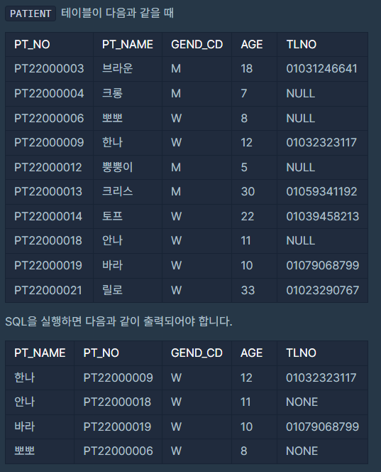 PT_NO, PT_NAME, GEND_CD, AGE, TLNO는 각각 환자번호, 환자이름, 성별코드, 나이, 전화번호를 의미합니다.