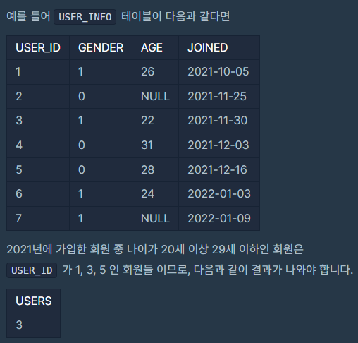 USER_ID, GENDER, AGE, JOINED는 각각 회원 ID, 성별, 나이, 가입일을 나타냅니다.