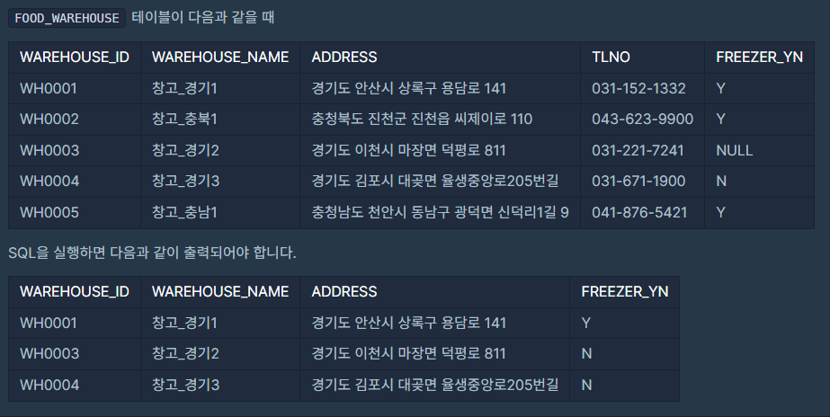 WAREHOUSE_ID, WAREHOUSE_NAME, ADDRESS, TLNO, FREEZER_YN는 창고 ID, 창고 이름, 창고 주소, 전화번호, 냉동시설 여부를 의미합니다.