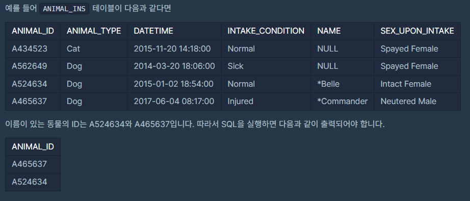ANIMAL_ID, ANIMAL_TYPE, DATETIME, INTAKE_CONDITION, NAME, SEX_UPON_INTAKE는 각각 동물의 아이디, 생물 종, 보호 시작일, 보호 시작 시 상태, 이름, 성별 및 중성화 여부를 나타냅니다.