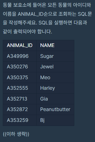 동물 보호소에 들어온 모든 동물의 아이디와 이름을 ANIMAL_ID순으로 조회하는 SQL문을 작성해주세요. SQL을 실행하면 다음과 같이 출력되어야 합니다.