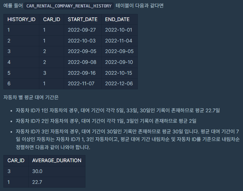 HISTORY_ID, CAR_ID, START_DATE, END_DATE 는 각각 자동차 대여 기록 ID, 자동차 ID, 대여 시작일, 대여 종료일을 나타냅니다.