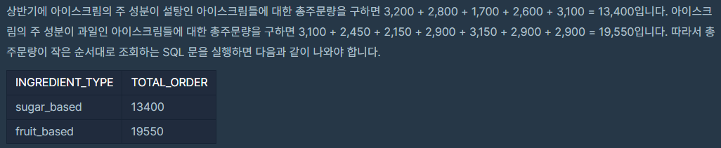 외래키는 Flavor 이기 때문에 각 Flavor로 조인을 시도합니다. 그리고 재료 타입은 ICECREAM_INFO 에, 총 주문량은 FIRST_HALF에 있는 컬럼이기 때문에 각각의 Alias를 부여해주며 Select 해줍니다. 이 때, 총 주문량은 모두 합쳐야 하기 때문에 Sum()을 해주고, 재료 타입을 기준으로 Group By 해줍니다. 마지막으로 총 주문량을 기준으로 정렬하면 문제에서 요구하는 결과물이 나오게 됩니다!