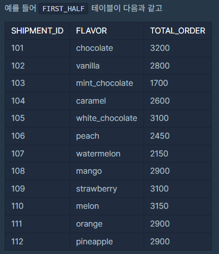 SHIPMENT_ID, FLAVOR, TOTAL_ORDER 는 각각 아이스크림 공장에서 아이스크림 가게까지의 출하 번호, 아이스크림 맛, 상반기 아이스크림 총주문량을 나타냅니다. FIRST_HALF 테이블의 기본 키는 FLAVOR입니다.