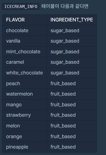 FLAVOR, INGREDITENT_TYPE 은 각각 아이스크림 맛, 아이스크림의 성분 타입을 나타냅니다. INGREDIENT_TYPE에는 아이스크림의 주 성분이 설탕이면 sugar_based라고 입력되고, 아이스크림의 주 성분이 과일이면 fruit_based라고 입력됩니다. ICECREAM_INFO의 기본 키는 FLAVOR입니다. ICECREAM_INFO테이블의 FLAVOR는 FIRST_HALF 테이블의 FLAVOR의 외래 키입니다.