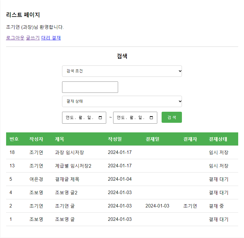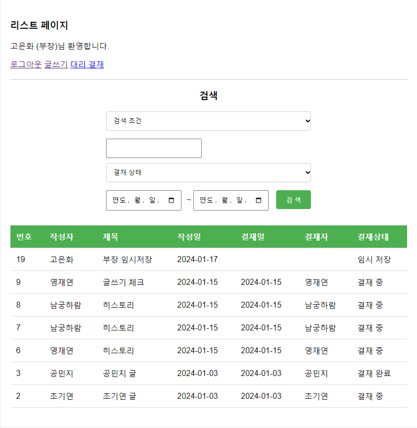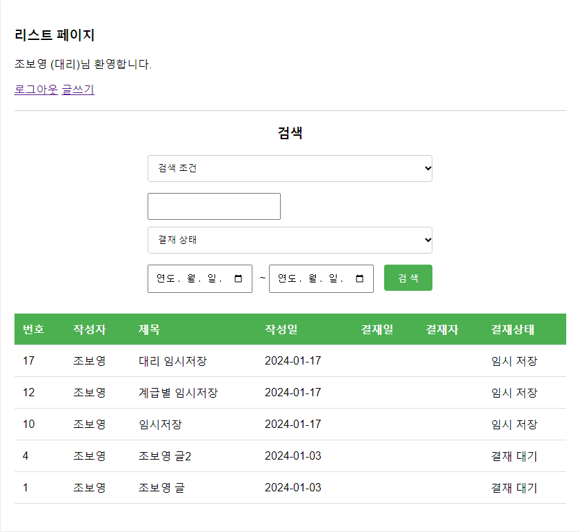 일부러 사원부터 부장까지 차례로 글을 써봤습니다. 임시저장 상태로 저장됨과 동시에 결재 정보가 없고, 각 리스트에 다른 사람의 임시저장 글은 보이지 않는 것도 함께 확인했습니다!