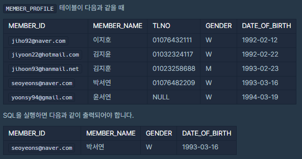 MEMBER_ID, MEMBER_NAME, TLNO, GENDER, DATE_OF_BIRTH는 회원 ID, 회원 이름, 회원 연락처, 성별, 생년월일을 의미합니다.