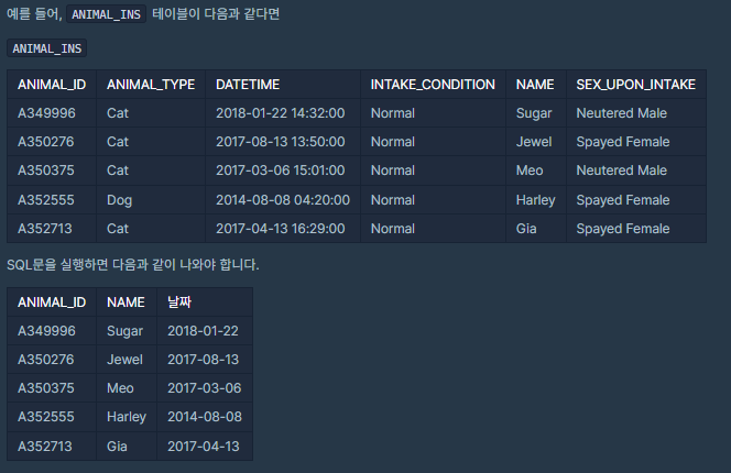 ANIMAL_ID, ANIMAL_TYPE, DATETIME, INTAKE_CONDITION, NAME, SEX_UPON_INTAKE는 각각 동물의 아이디, 생물 종, 보호 시작일, 보호 시작 시 상태, 이름, 성별 및 중성화 여부를 나타냅니다.