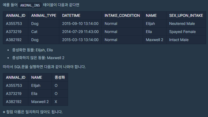 case문을 이용해서 완성해 줬습니다. Neutered와 Spayed가 포함 되면 O, 그 외에는 X로 표기되게 해줬습니다.