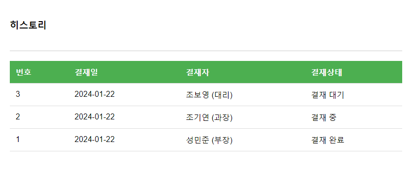 결재 상태에 따라 내용 추가 : 상태 변화(A ▶ B)가 생길 때마다 히스토리 테이블에 추가해줍니다.