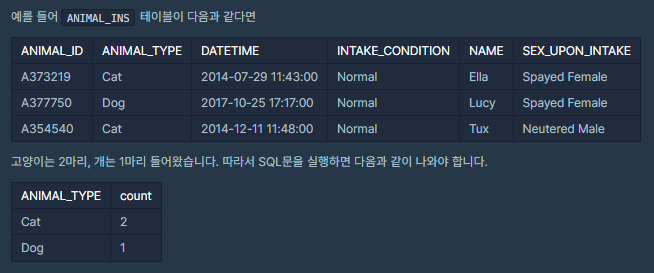 데이터에 고양이와 강아지만 존재하고 그 둘만 조회하는 것이므로 간단하게 조건없이 group by로 묶어줬습니다.