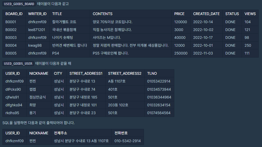 USED_GOODS_USER 테이블 : USER_ID, NICKNAME, CITY, STREET_ADDRESS1, STREET_ADDRESS2, TLNO는 각각 회원 ID, 닉네임, 시, 도로명 주소, 상세 주소, 전화번호를 의미합니다.