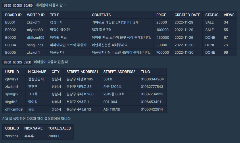 USED_GOODS_BOARD 테이블 : BOARD_ID, WRITER_ID, TITLE, CONTENTS, PRICE, CREATED_DATE, STATUS, VIEWS는 게시글 ID, 작성자 ID, 게시글 제목, 게시글 내용, 가격, 작성일, 거래상태, 조회수를 의미합니다.